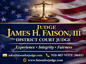 The Honorable James H. Faison III proudly served New Hanover and Pender Counties as a District Court Judge for over 25 years, and looks forward to continuing his steady, principled leadership-one that balances integrity, fairness, and discernment.